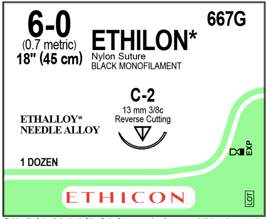 Ethicon Nylon Black Monofilament Suture 6-0, 18" C-2 Needle (667G). Reverse Cutting, 3/8 Circle. 12/BX.